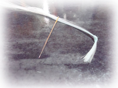 また水でぬらしてサッと針穴に通しました。)