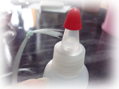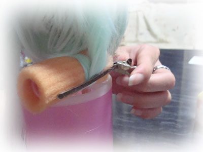 大体完成したら、ウィッグの裏の結び目を木工用ボンドで