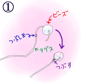 1. まず、テグスにつぶし玉、ビーズの順に通します。