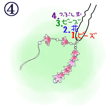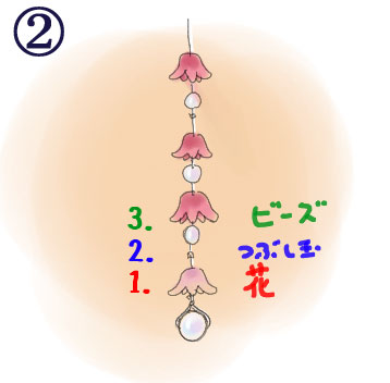 次にビーズを通して、(花弁)花→つぶし玉→ビーズ→(花弁)花 と、