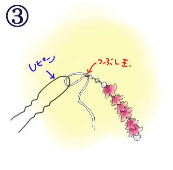 3. 好みもありますが、大体6~8個の花を通し終えたら、テグスにつぶし玉を